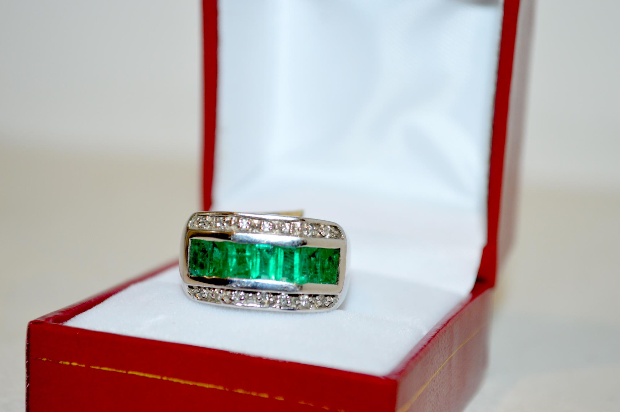Anillo Elaborado en Oro Blanco con Esmeraldas Baguette y Doble Linea de Diamantes, Oro 13,2gr ESM 2,2ct DIA 0,27ct